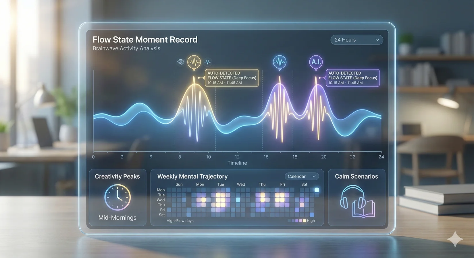 当你进入深度工作、创作或冥想时,界面呈现汇聚的光束,象征意识的聚焦与心流的开启。